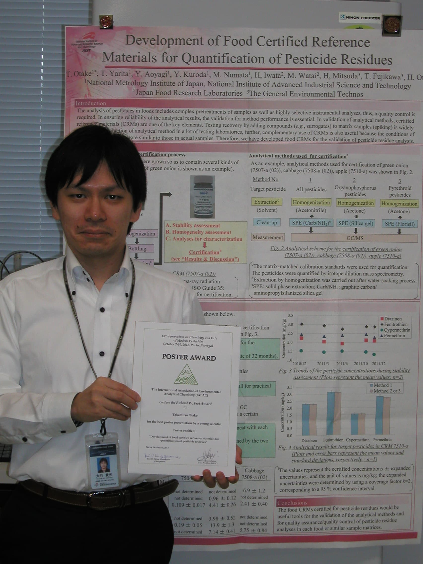 | 13th Symposium on Chemistry and Fate of Modern Pesticides, 7-10 October 2012, Porto, Portugal | Takamitsu Otake, National Metrology Institute of Japan. National Institute of Advanced Industrial Science and Technology, Tsukuba, Japan “Development of Food Certified Reference Materials for Quantification of Pesticide Residues” |